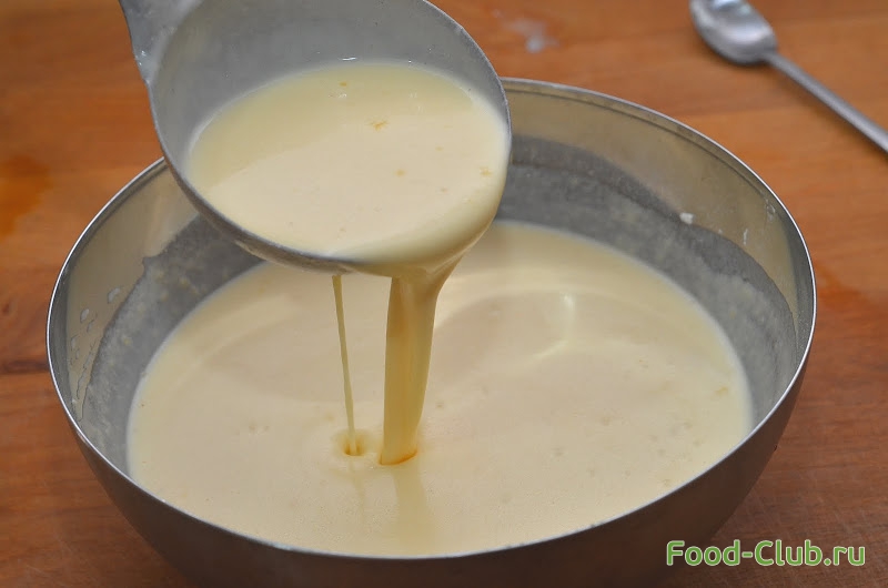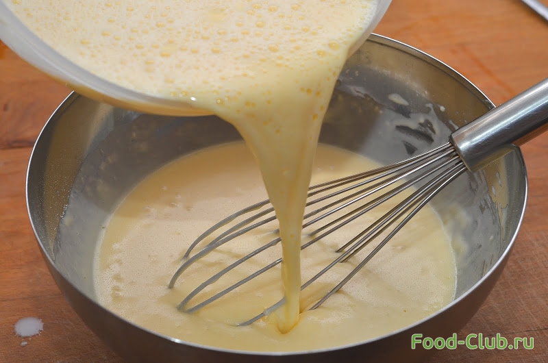 2. В отдельной посуде взбейте яйца с молоком. В сухие ингредиенты вылейте половин молочной массы и хорошенько перемешайте до однородности. Добавьте охлажденное растопленное масло и снова перемешайте.