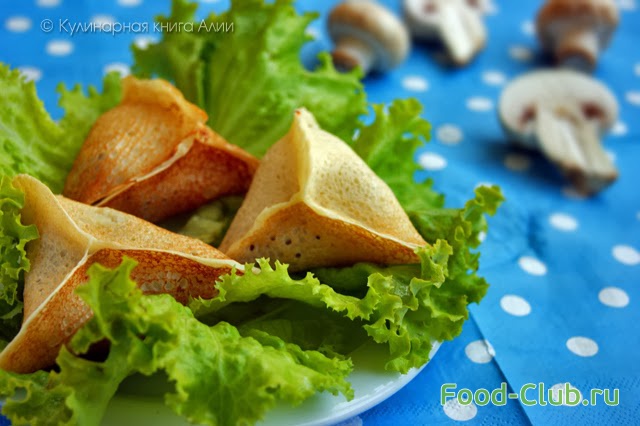 4. В центр каждого блинчика положите начинку, потом немного тертого сыра и сверните такие треугольнички. Сторона блина останется немного липкой и скрепить краешки не составит труда. Готовые блинчики выложите на противень, прогрейте духовку и подержите там блинчики, чтобы сыр расплавился.
