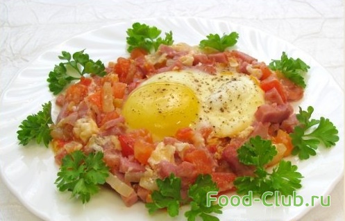 5. Залить яйцами поджаренные помидоры и мясо, закрываем опять крышкой на пять минуток до тех пор, пока яйца не загустеют.