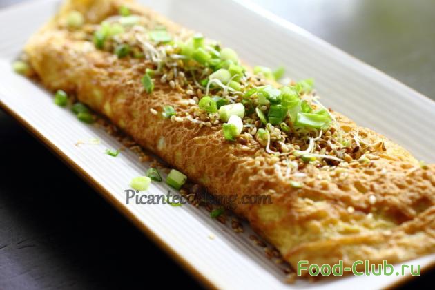 3. Переложите готовый омлет на тарелку и посыпьте кунжутом и зеленым луком. Подавать такой омлет можно с соевым соусом. Приятного аппетита!
