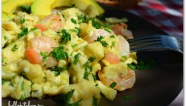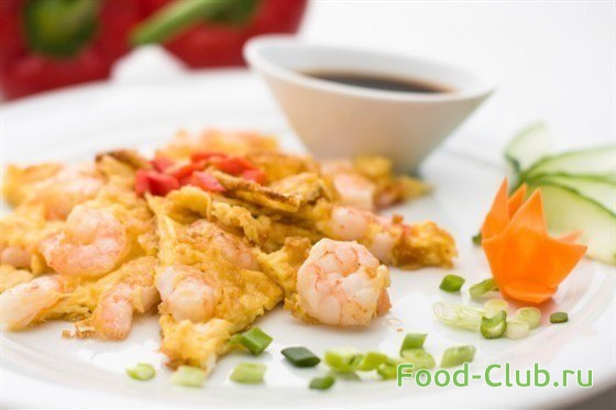 Этот омлет- идеальное начало нового дня! Вкусный, нежный и ароматный, подарит вам заряд бодрости на весь день. На 100 грамм такого омлета приходится 100 калорий.1. Если креветки заморожены, разморозьте их и слейте воду. Для этого рецепта лучше всего использовать мелкие креветки.