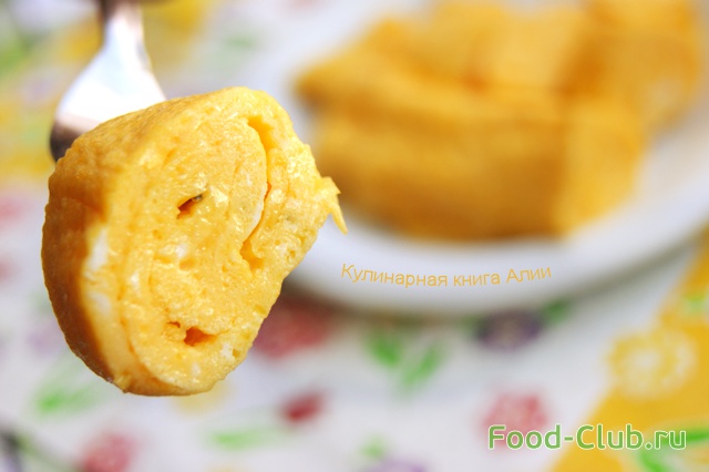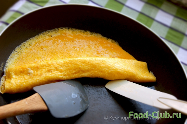 2. Вооружившись лопаткой, ухватитесь за самый побелевший краешек омлета и аккуратно сверните рулетик. Внимание, ждать, пока верх омлета пропечется не нужно! Сворачивайте омлет тогда, когда серединка еще не прожарилась. Пока вы будете сворачивать рулет, он успеет пропечься.