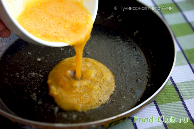 1. На медленном огне растворите на сковородке сливочное масло. Оно должно медленно плавиться, а не пузыриться и шипеть. Тем временем в мисочку разбейте яйца и венчиком перемешайте их до однородности. Пены добиваться не нужно, суть в том, что яйца нужно именно перемешать, а не взбивать. Теперь тоненькой струйкой, постоянно помешивая, влейте горячее растопленное масло в миску с яйцами.