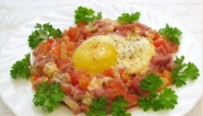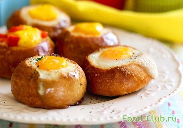 3. Аккуратно разбиваем сверху яйцо, солим и перчим. Раскладываем булочки на противень и выпекаем 10-12 минут, а потом покрываем противень фольгой и снова отправляем булочки в духовку минут на 20-25 или до того момента, пока яйцо не будет готово.
