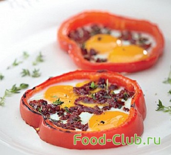 Расскажу Вам рецептик очень необычной, на мой взгляд, глазуньи с вялеными помидорами. Завтрак из такого блюда очень быстрый и очень по-экзотичному вкусный.1. Для начала надо нарезать болгарский перчик на четыре колечка толщиной семь миллиметров. Удалить из перца семена. А томаты надо порубить.