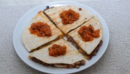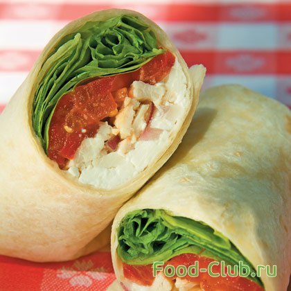 3. Лаваш подогрейте слегка в микроволновке (около 10 секунд, не обязательно). В лаваш положите часть получившейся заправки, затем курицу, томаты, зеленый салат и оставшуюся заправку. Заверните лаваш в ролл.
