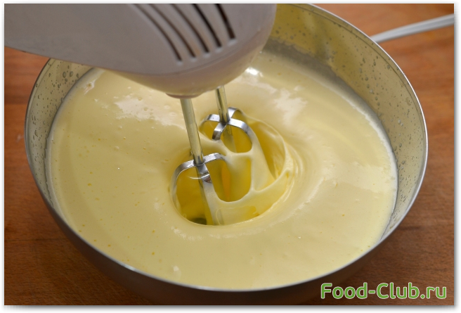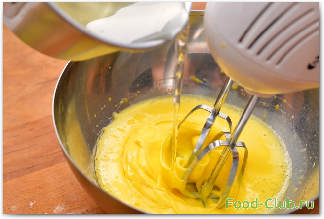 7. Взбиваем желтки, и, продолжая взбивать, тонкой струйкой вливаем сироп. Массу необходимо взбивать, пока она не остынет.