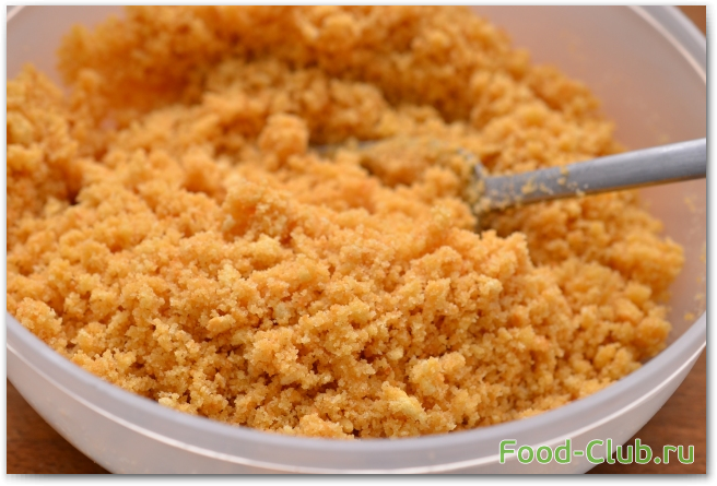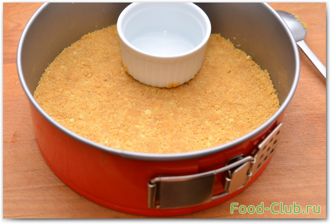 5. Выкладываем крошку на дно разъемной формы и распределяем равномерно при помощи ложки, утрамбовываем стаканом с плоским дном. Корж отправляем в холодильник для застывания. Форму используем на 23-25 см.