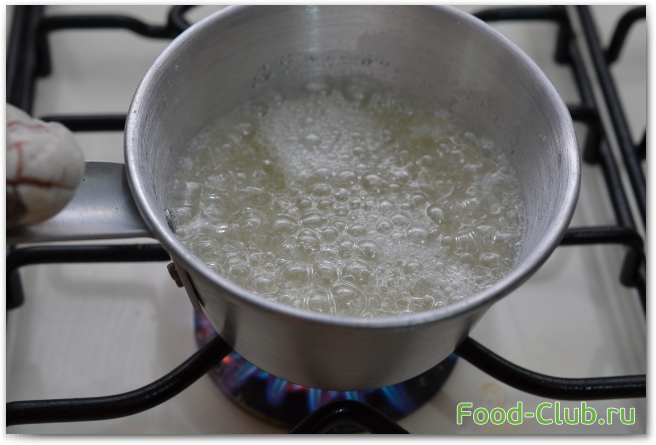6. Делаем сироп, для этого на медленном огне растворяем сахар в 80 мл воды. Как только сахар растворился, увеличиваем огонь до максимума, доводим раствор до кипения, варим 1 минуту, а затем снимаем с огня.
