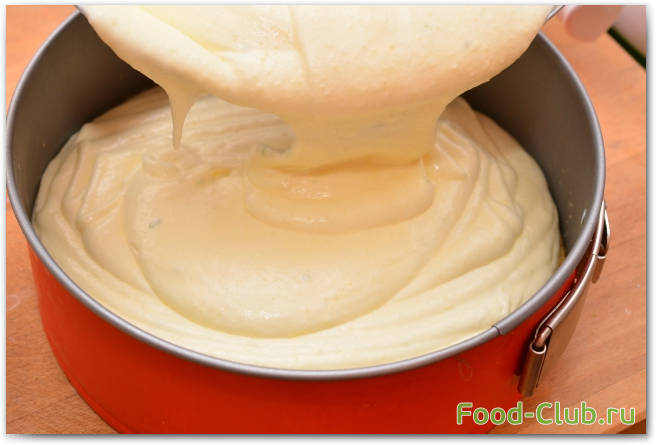 13. Выливаем приготовленную массу в форму на остывший корж. Накрываем слой пищевой пленкой и убираем в холодильник на ночь. Это время необходимо, чтобы чизкейк «созрел» и его вкус стал более насыщенным.
