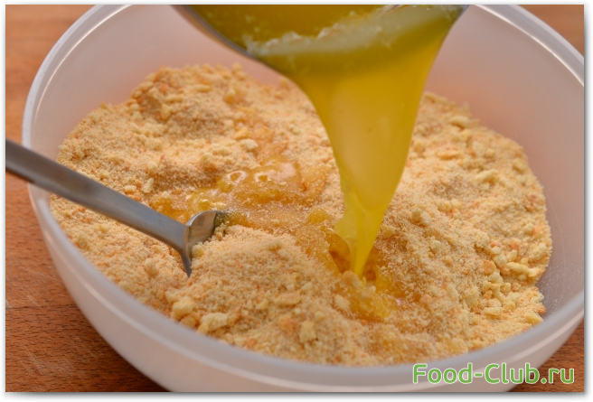 3. Масло выливаем в крошку. В качестве печенье можно брать любое: бисквитное, овсяное или даже печенье в шоколаде. Так же по желанию можно добавить миндальную крошку или заменить печенье миндальной мукой. Очень вкусно получается чизкей с печеньем савоярди, которое используют для приготовления тирамису.