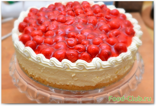 15. Аккуратно выкладываем вишни вместе с соком на чизкейк, начиная с центра.