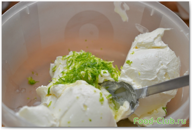 10. Перемешиваем крем чиз с цедрой и соком лимона. Взбиваем до однородности, добавляем желатин и вновь хорошо перемешиваем. Соединяем обе массы, хорошо перемешиваем миксером.
