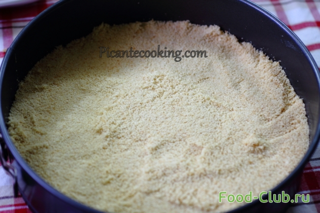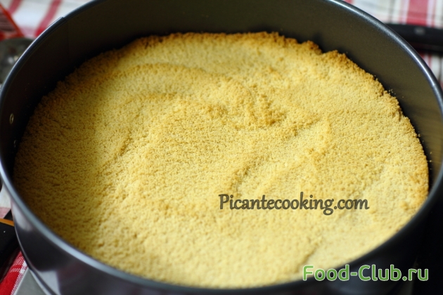 2. Добавляем масло, пудру, все хорошо перемешиваем до однородности. Получившуюся массу перекладываем в разъемную форму и утрамбовываем.