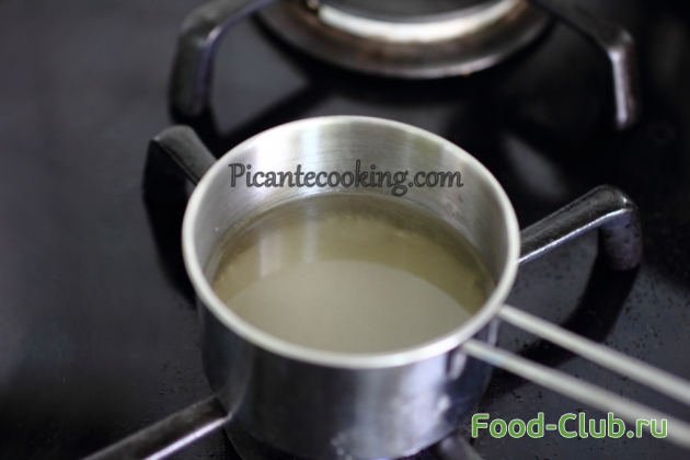 9. Как только сырная масса застынет, приступаем к приготовлению желе. Для этого из воды и сахара делаем сироп, остужаем и вводим в желатин. Мешаем его до полного растворения.