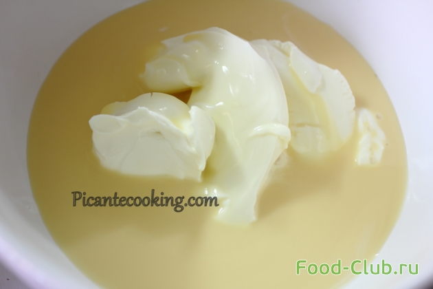 5. В отдельной емкости взбиваем до однородности сгущенное молоко и сыр.