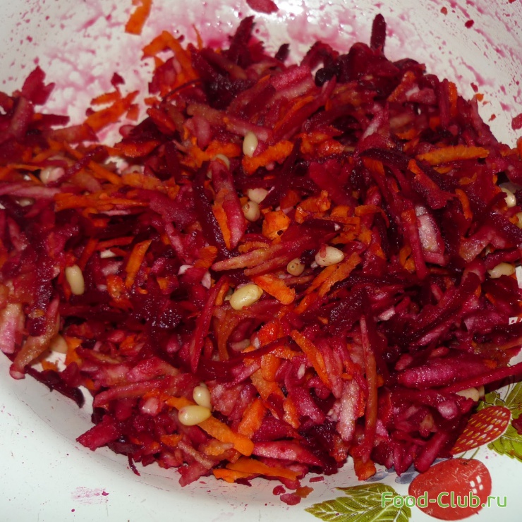 3. Когда свекла с морковью будут готовы, охладите их. А в это время морковь нашинкуйте или натрите на терке. Смешайте со свеклой и морковью, посолите, поперчите. По желанию можно еще добавить кедровых орешков (советую чуток поджарить их на сковороде). Подавайте к столу.