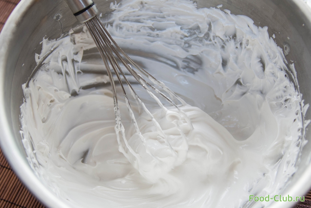 1. Слегка взбейте белок с щепоткой соли, затем добавляйте сахарную пудру и взбивайте до образования плотных стоящих пиков.