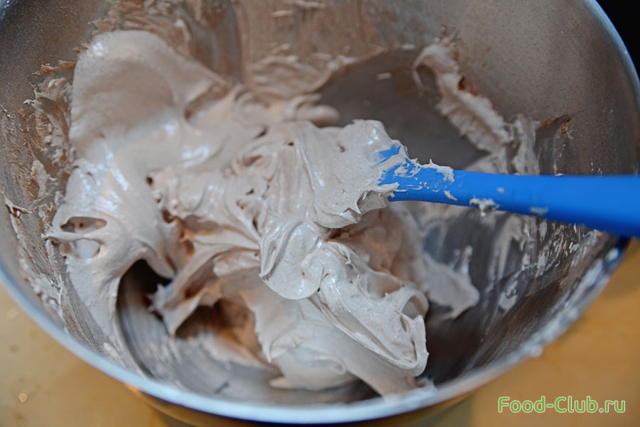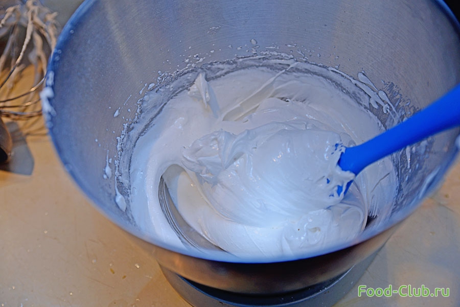 1. Белки взбейте до слабых пиков, добавьте сахарную пудру и взбейте до плотных пиков.