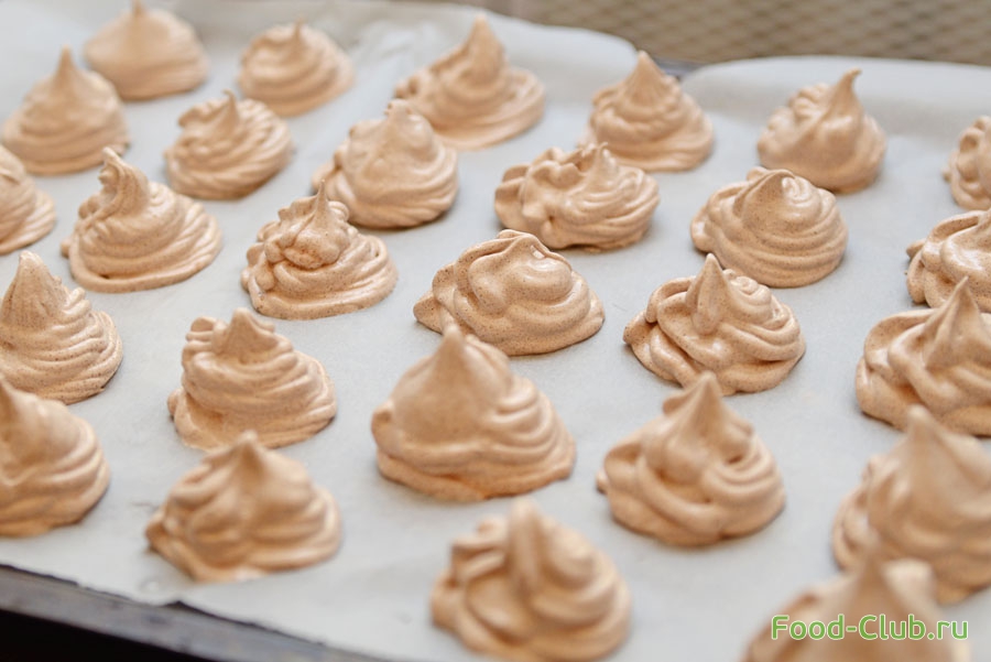 3. Выложите на противень полученную массу в виде небольших комочков. Сделать это можно с помощью специального кондитерского шприца или мешка, если нет, то сделайте это просто ложкой. Поставьте в духовку сушиться примерно на 2 часа.