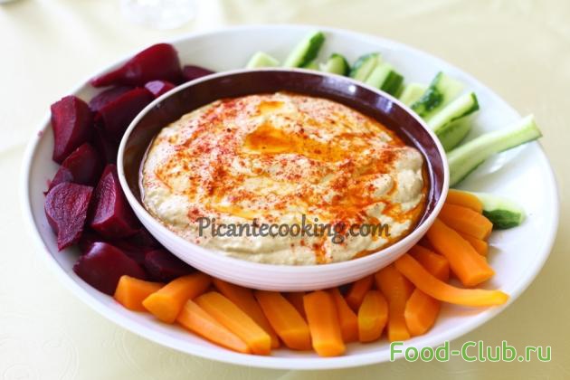 Подается хумус к овощам, с чипсами, питой или лавашем.