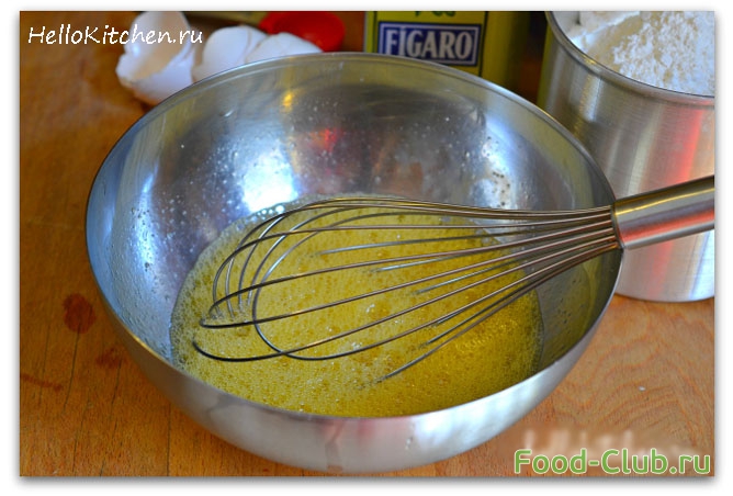 1. Вначале приступаем к приготовлению теста, для этого слегка взбиваем яйцо, оливковое масло соду и соль.