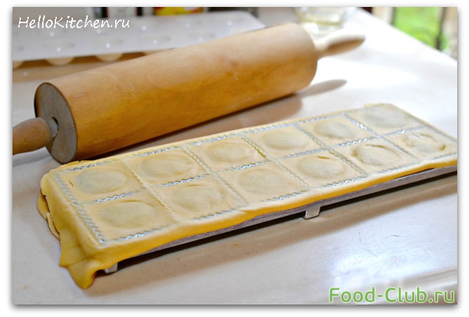 14. Вынимаем получившиеся равиоли из формы, выкладываем на присыпанную мукой рабочей поверхности и накрываем полотенцем, чтобы не подсыхали.