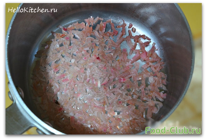 6. В это время приступаем к приготовлению соуса. Перемешиваем лук, вино и уксус в небольшой кастрюле и ставим на малый огонь, пока жидкость не выпарится.