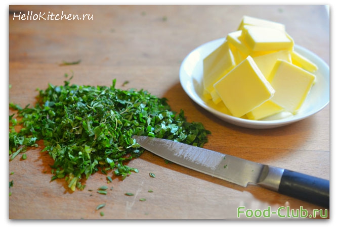7. Измельчаем зелень, сливочное масло нарезаем на квадраты.