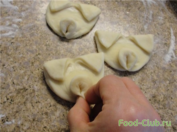 3. Смажьте верхнюю часть овала водой, сделайте с этой стороны надрез и подогните два края, чтобы получились ушки. Слегка прижмите края к тесту, чтобы они приклеились.