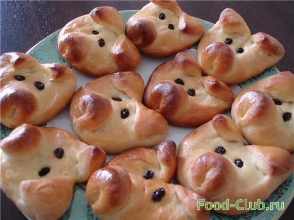 5. Смажьте «свинок» слегка взбитым желтком, вместо глазок вставьте изюминки. Переложите на противень и поставьте в духовку на 20 минут.