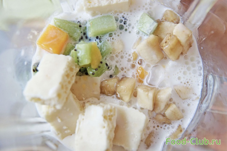 Фрукты очистите от кожуры и нарежьте на кусочки. Шоколад поломайте на маленькие кусочки. Все ингредиенты положите в блендер и измельчите до однородной консистенции.Приятного аппетита!