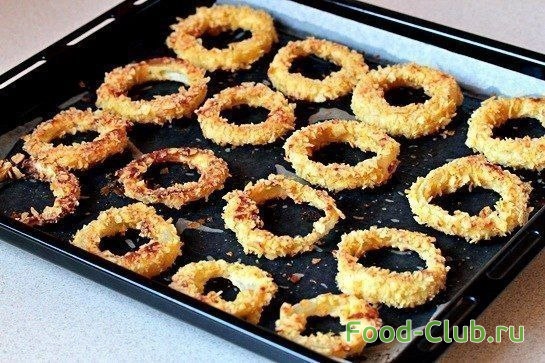 3. Готовые кольца выложите на противень и выпекайте каждую сторону до золотистой корочки по 8 минут в среднем. Когда лук готов, сразу посолите его, пока он еще горячий. Готово! Подавать эту вкуснятину лучше всего с каким-нибудь соусом. Приятного аппетита!