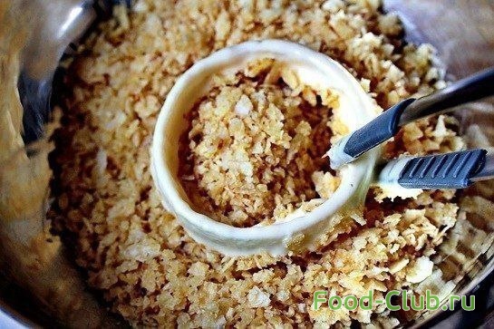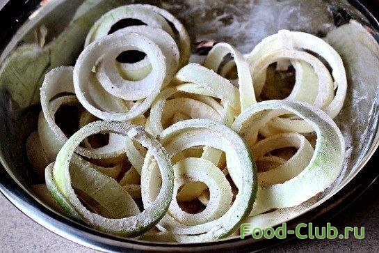 Пока греется противень, продолжаем работать с луком. Каждое колечко лука вываляйте в мучной смеси, затем окуните в тесто, дайте ему немного стечь и обваляйте кольцо в чипсах. -