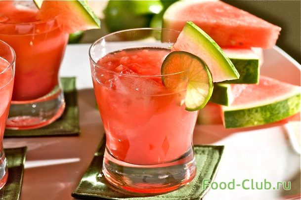 Все перечисленные ингредиенты кладем в блендер и хорошенько взбиваем.Когда коктейль будет готов, охлаждаем его в холодильнике, можно при помощи льда. При подаче украшаем дольками лимона, листочками мяты или кусочками арбуза.Коктейль можно превратить в алкогольный, добавив в него немножко рома.