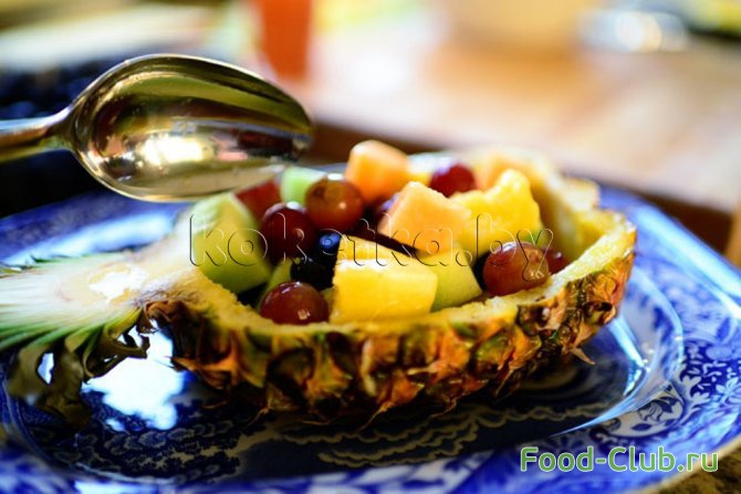 13. Выкладываем фрукты в ананасовые чаши и подавайте к столу. Приятного аппетита!