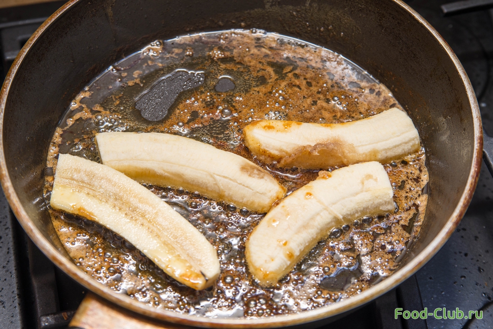2. Бананы порежьте, перемешайте сахар и добавьте бананы на сковороду. Готовьте около 3 минут на слабом огне до карамелизации и размягчения бананов.