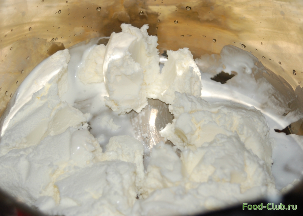 1. Для начала в большую кастрюлю выложите мороженое. Разломайте его на кусочки. лучше всего использовать слегка размягченное мороженое, чтобы было легче работать миксером.