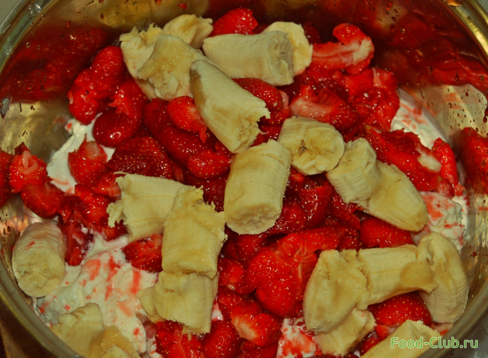 2. Клубнику и разломанный на кусочки банан добавьте в кастрюлю.