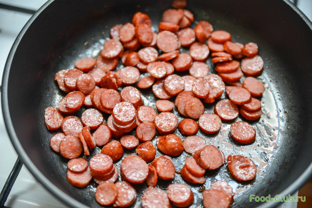 1. Колбаски порежьте на небольшие кусочки и сковороде в кастрюле на сливочном масле. Снимите с плиты.