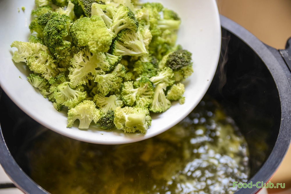 3. Брокколи разделите на маленькие соцветия и добавьте в кастрюлю вместе с бульоном. Готовьте 15 минут.