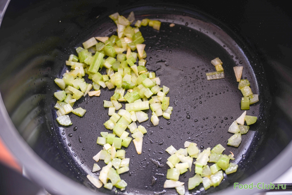2. В это время порежьте на небольшие кусочки сельдерей и обжарьте на сливочном масле в кастрюле.