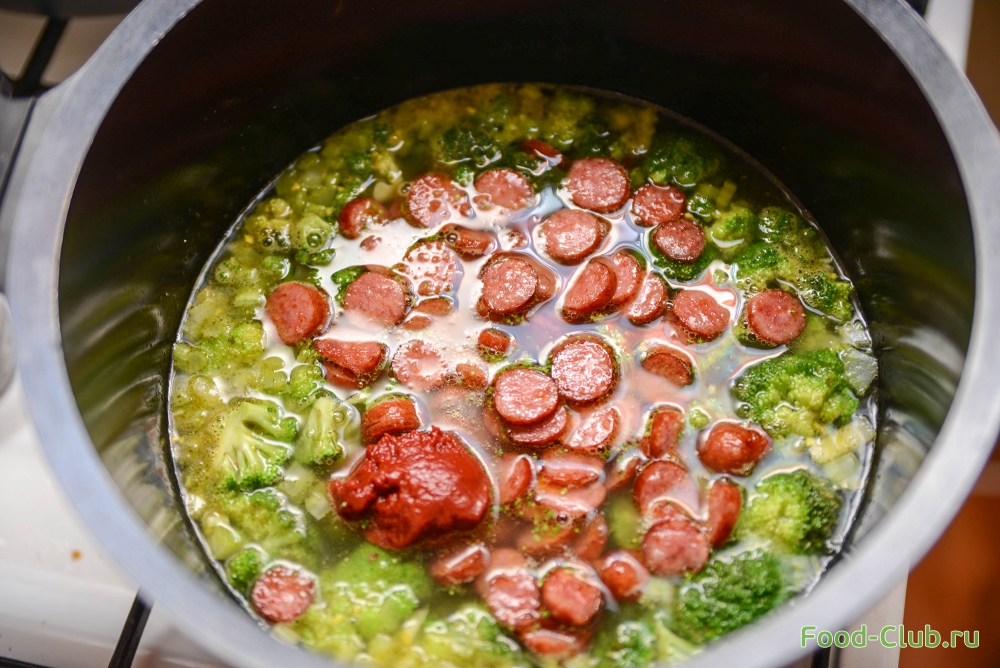 4. Добавьте в кастрюлю колбаски, томатную пасту, соль, перец и зелень (можно петрушку, базилик). Готовьте еще 7-10 минут.