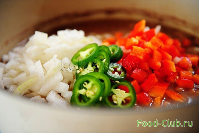 3. Затем добавляем в суп нарезанные кубиками лук, красный сладкий перец, мелко измельченный чеснок и перец чили.