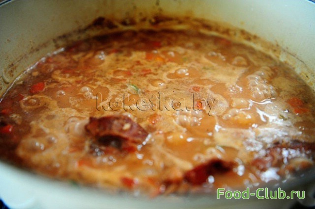 2. Высыпаем фасоль в кастрюлю с мясом, заливаем водой. Доводим до кипения на большом огне, затем максимально сбавляем пламя, накрываем кастрюлю крышкой и варим 2 часа, при необходимости добавляя выпарившуюся воду.