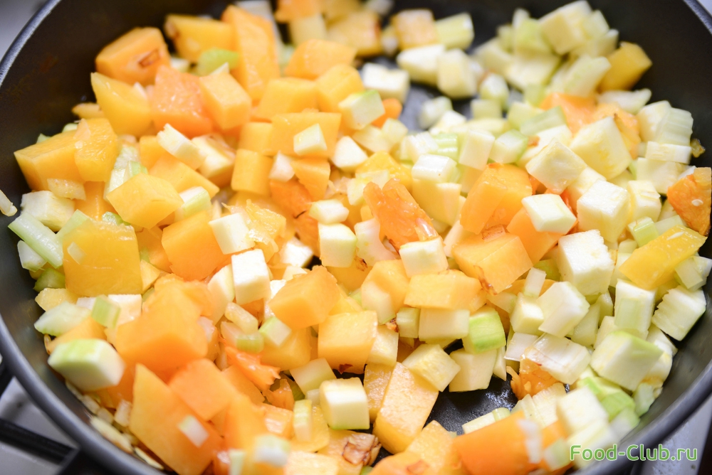 4. Затем добавьте порезанную на небольшие кусочки тыкву и сельдерей, готовьте на среднем огне около 4 минут.