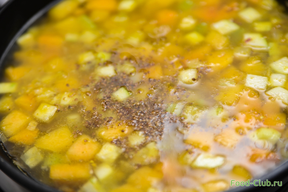 5. Добавьте бульон и специи, готовьте при слабом кипении 15-20 минут до готовности тыквы.