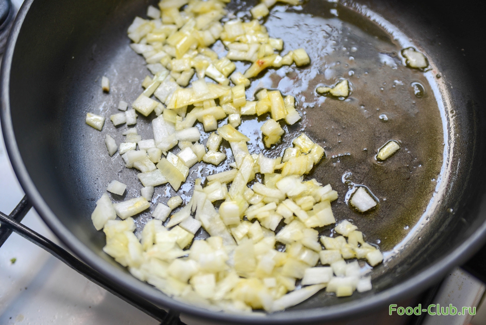 3. В большой сковороде обжарьте порезанный лук с растительным маслом в течении 3-4 минут.