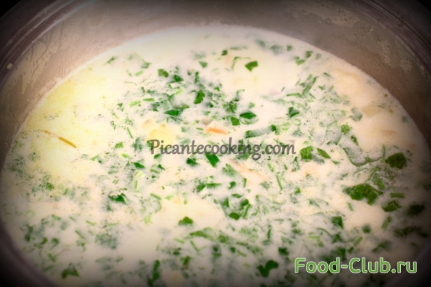2. Варите суп минут 10, а потом добавьте цветную капусту, посолите по вкусу и варите минут 7-8. Влейте сливки, доведите до кипения, а потом добавьте зелень и снимите с огня. Готовый суп накройте крышкой и дайте постоять еще минут 5.