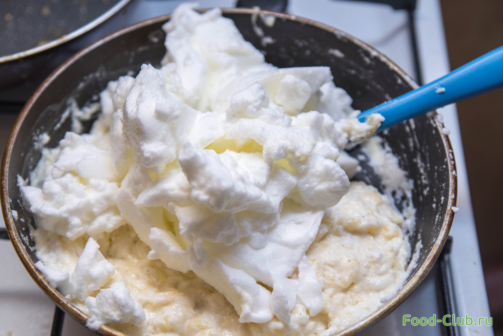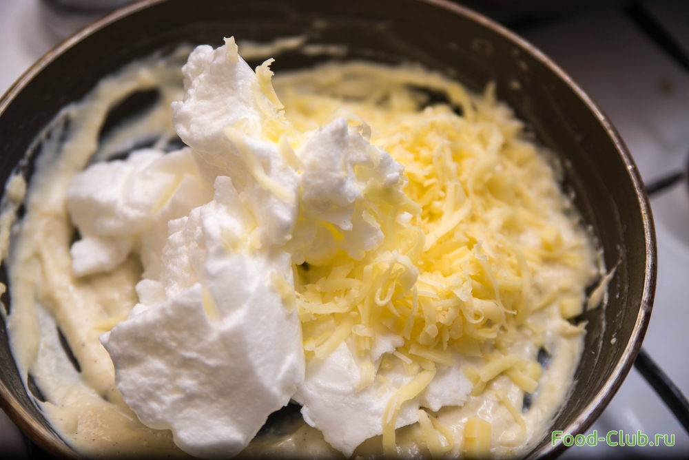6. Смешайте ¼ часть взбитых белков со всем тертым сыром (оставьте около 2 ст.л. тертого сыра на потом) и приготовленным соусом бешамель. Перемешайте аккуратно смесь.